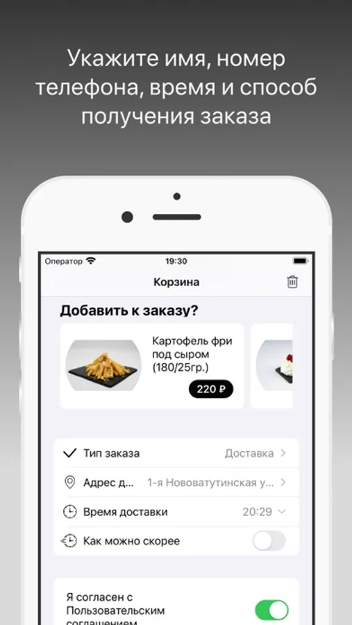 Укажите время, когда хотите прийти за своим заказом или выберите доставку с указанием времени и адреса доставки.