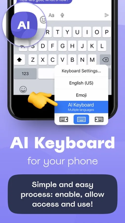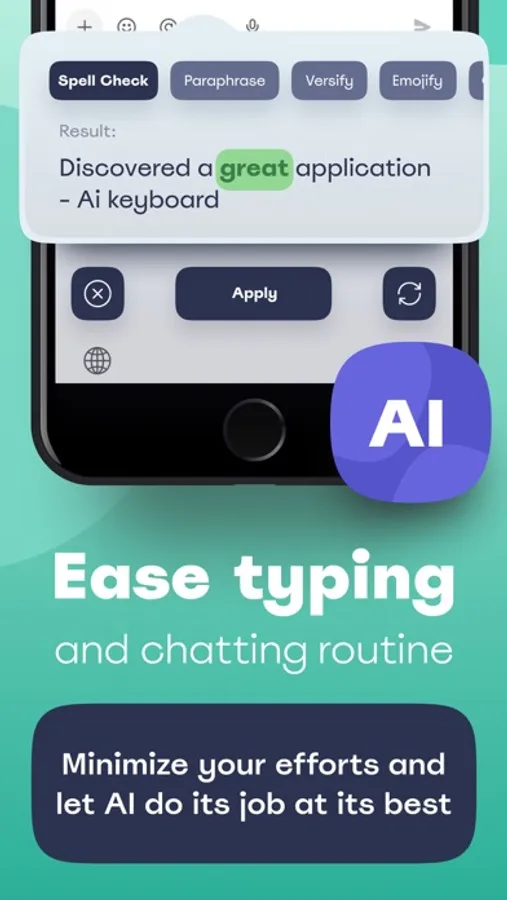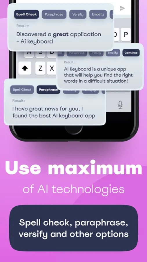 Bring your typing and chatting experience to the next level with the access to latest AI technologies from any text box on your phone and make your experience with keyboard more even more nice and easy. Generate ideas right from your conversations, re-phrase great people & classics, research or ask for advice and lot of othe option right with just a one tap!