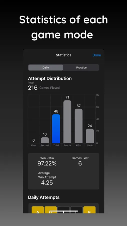 1) Daily: Each day, players face the same word challenge. Engage with cool extra effects and test your word-solving abilities. This mode allows you to play once a day and offers separate statistics to track your progress.