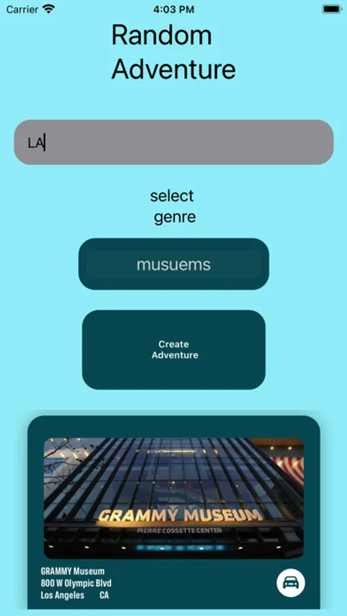 Ever wanted to do something in a city but was not sure what to do? Select a genre and allow the randomize to select something random for you to do within the city radius.