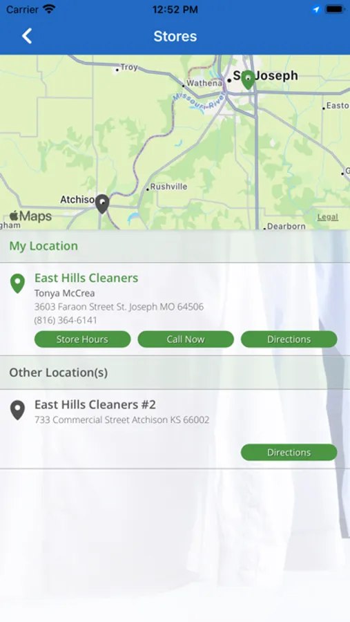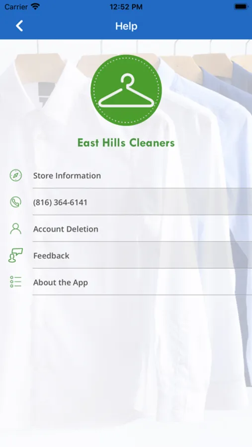 5) Quickly contact East Hills Cleaners by phone or email and access their website all directly from your device.