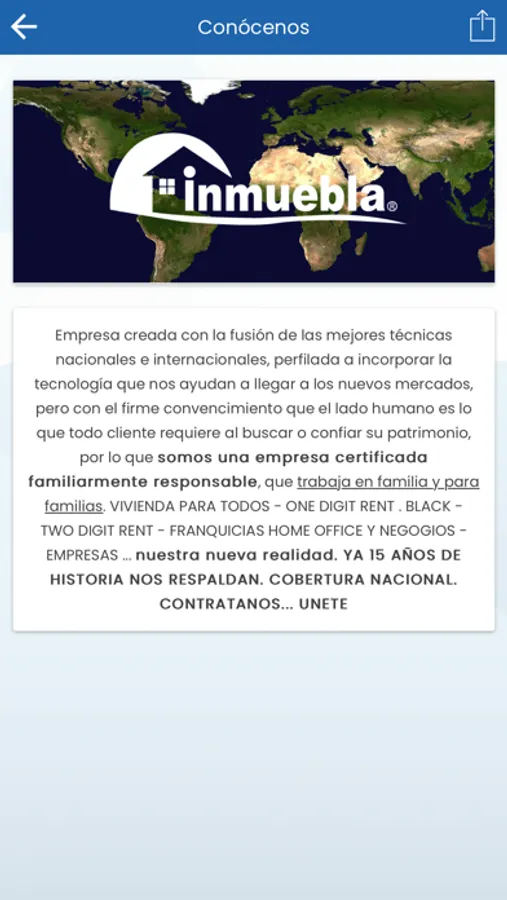 Somos una empresa 100% Mexicana. Legalmente constituida desde 2007. Los orígenes de la marca Inmuebla se remontan desde el año 1999. Más de 15 años de experiencia nos respaldan! Dentro de nuestra App Inmuebla encontrarás las propiedades que se adaptan a tu necesidad... Ya sea que quieras comprar, vender o rentar, siempre encontrarás las mejores opciones para ti. ¡Bienvenido a Inmuebla!