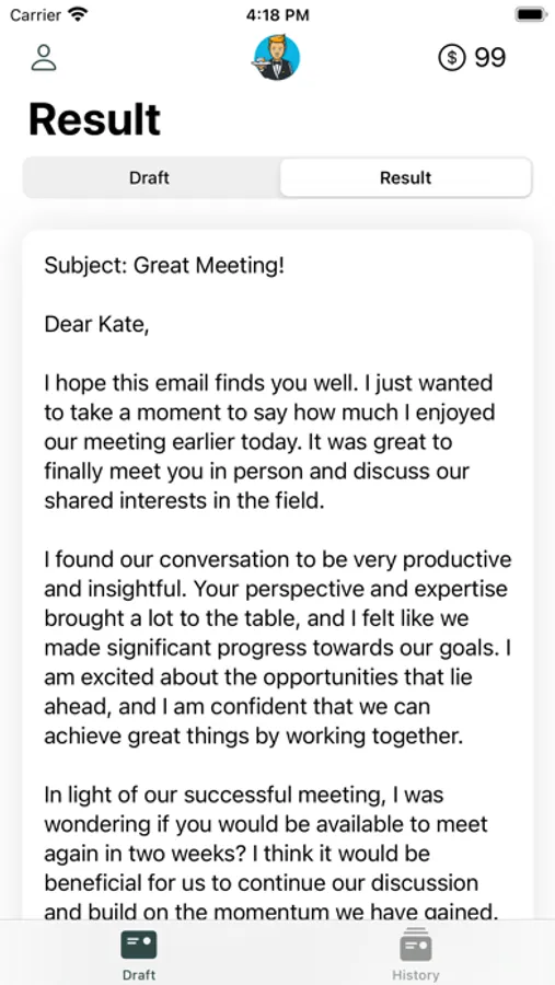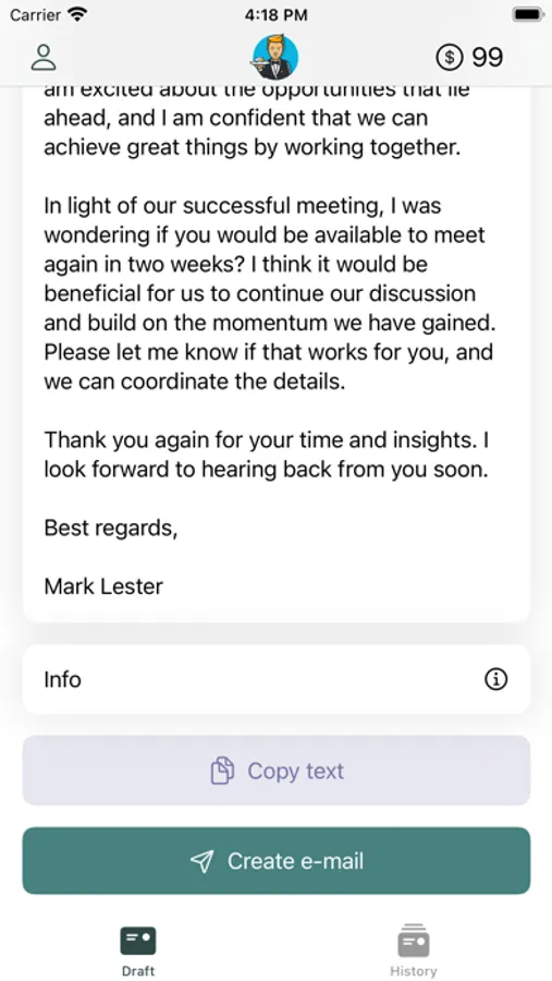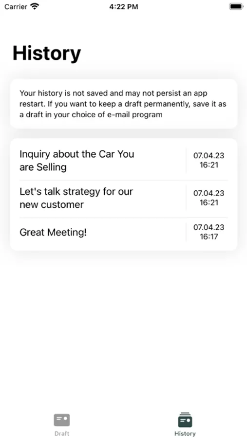Got an e-mail to write? Write down the topics you want to address and Quick Mail will help you draft the e-mail in seconds. Formal or informal, an e-mail or a quick message, English or German - you choose. Describe your usual writing style with a couple of adjectives to improve the generated drafts. Finally, edit the generated draft to then either copy the text or go straight to the iOS Mail app.