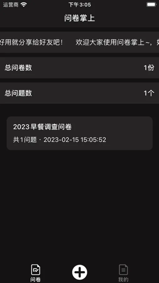 问卷掌上是专门用于便捷式问卷生成的简易工具,可以方便日常生活与工作中快速进行各类调查问卷的生成,然后通过分享来打印问卷,是各类技术人员,市场调研人员不可或缺的掌上工具。