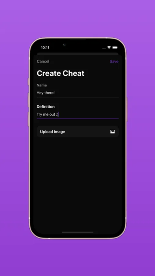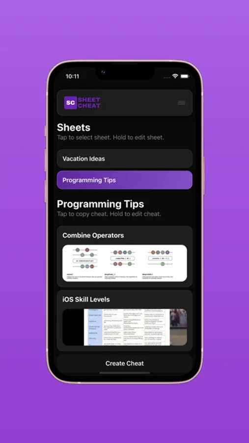 Easily create cheatsheets to have important information on demand. If you find yourself referencing the same information time and time again, simply create a cheat sheet to have easy access. You can have as many cheats as you'd like. Tap a cheat to copy its text.