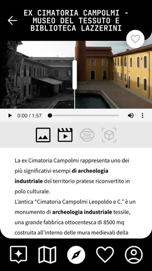 L’App di “TIPO – Turismo Industriale Prato” consente di fare un’esperienza immersiva nei luoghi legati al distretto tessile della città. Protagonisti del percorso i monumenti di architettura idraulica, alcune aziende di eccellenza attive, ex opifici trasformati in spazi culturali che sono luoghi nevralgici – ieri come oggi – della vita economica e culturale della città.