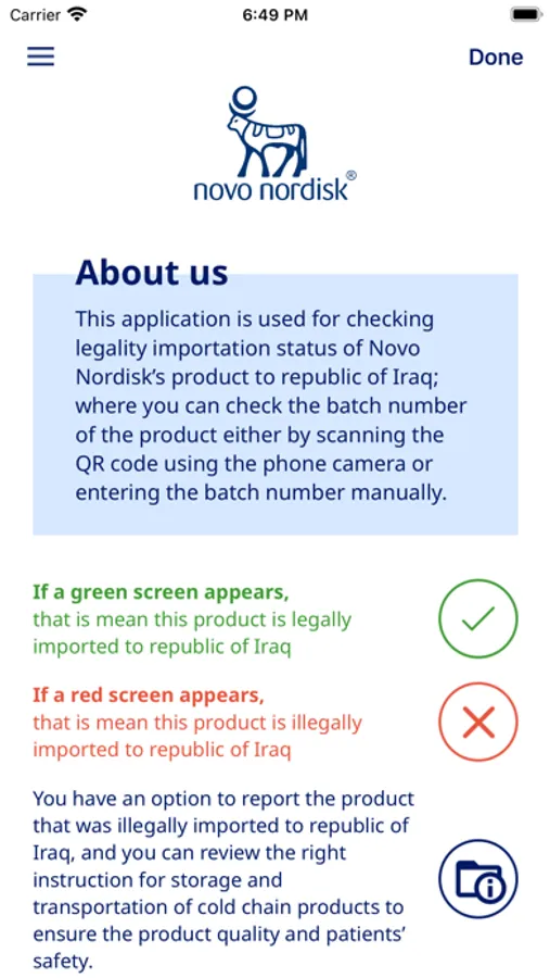 This application is used for checking legality importation status of Novo Nordisk’s product to republic of Iraq; where you can check the batch number of the product either by scanning the batch number using phone camera or entering the batch number manually,