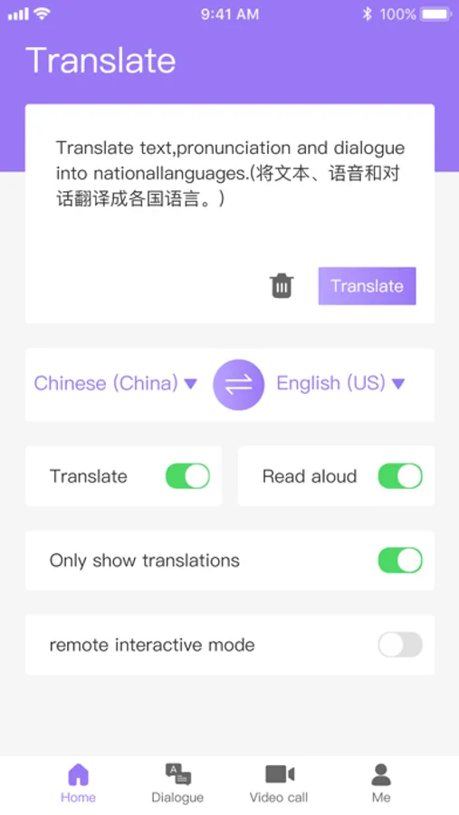 ▶Simultaneous interpretation: remote 1-to-1 voice/video call, real-time translation of the voice heard, and bilingual subtitles appear.