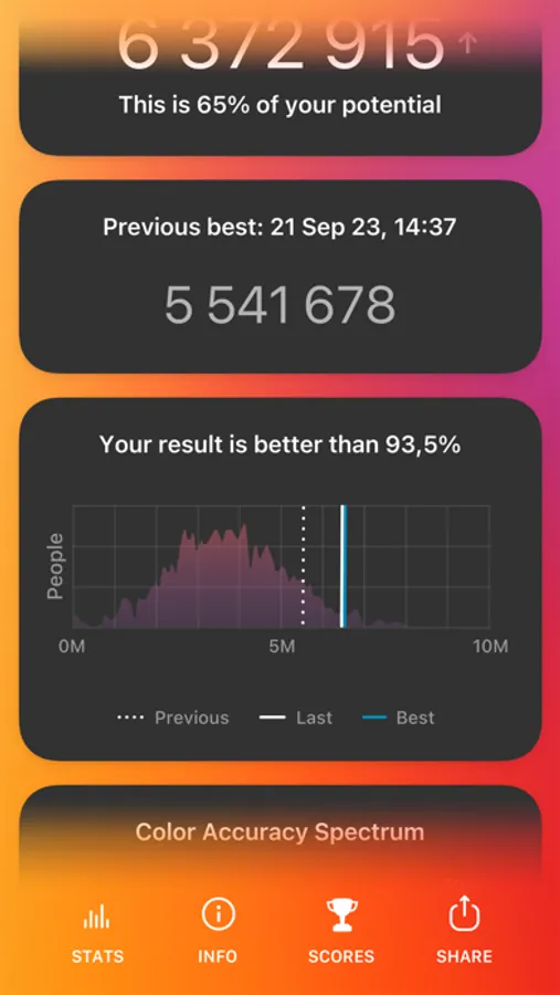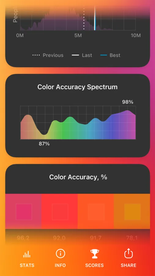 Done a handful of these over the years, and this is a great addition. Would love to see other “games” or “leaderboards” in the future for different color schemes. Complimentary matching, triads, analogous, etc! Love the design and simplicity, still a 5star app, but I have x3 critiques… 1. It would be great to be able to revisit past accuracy in detail, and not just the score. “Great I hit 99.4 on magenta this time, but wait, what’d I get last time?” was an experience I had and realized I could only see my overall score. 2. A fine nudge “+,-“ on either side of the the modification wheel would be great. No value display needed, but when it’s not just right sometimes I want the smallest nudge, not a drag 3. A speed based version of the existing (and any future game/tool) would be really cool. I’d consider this current version an Any%. But I’d love to test myself in a 30/15/5 second limit (per color) of the same experience. It’d be really helpful to know how much that extra 10+ seconds helps with my “gut accuracy” of my 5 second run vs. my 15sec run for work. Great work team! Keep it alive!
