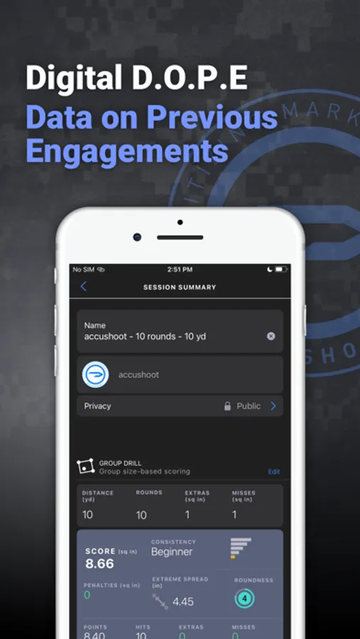 Using your D.O.P.E. AccuShoot builds an advanced statistical model that constantly predicts your shooting performance under different stress situations. This personalized model works for different distances and types of guns while tracking your performance over time so you can quantify the impact of your training.