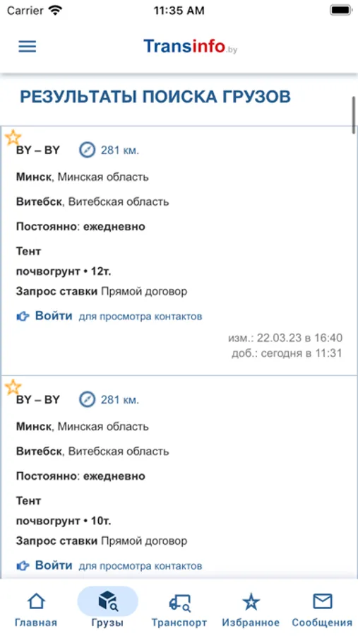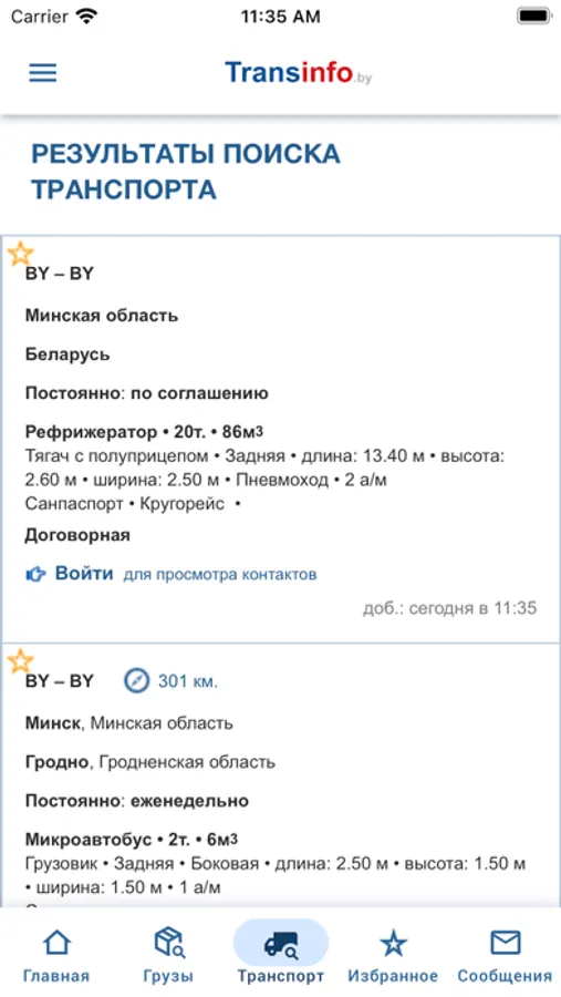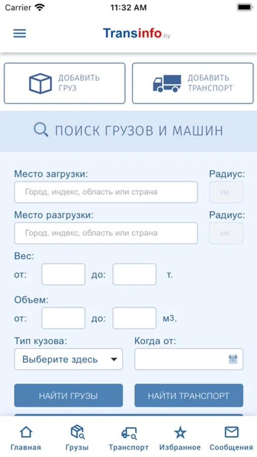 • Поиск грузов и транспорта по базе Transinfo
