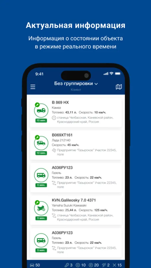 С помощью данного приложения можно не только следить за автопарком в режиме реального времени с планшета или смартфона, но и получать полную историю передвижения за необходимый период времени. "Агровижен" позволяет группировать ТС по подразделениям, моделям и текущему статусу, а также осуществлять загрузку геозон, ранжировать скорости и задавать раскраску треков.