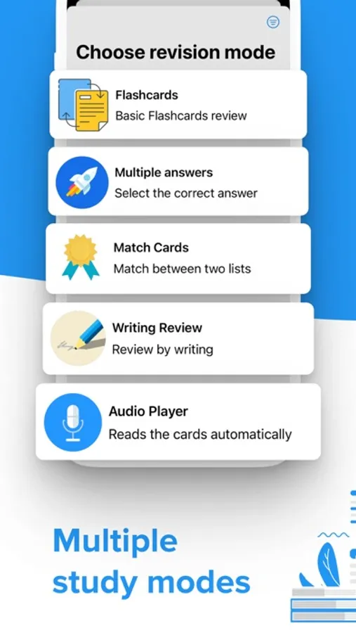 - MULTIPLE STUDY MODES: Stay engaged during study sessions with multiple review modes, including writing review, multiple-choice answers, audio playback, and classic flashcard review.