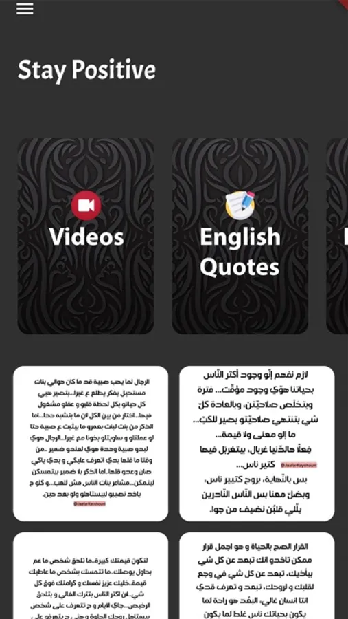 Stay positive is an application which contains Arabic quotes and English quotes which can be saved, in other hand it contains a motivational Arabic videos which are related to Jaafar Rayshouni , you can add the quotes to favorites to view at any time and u can download any video to your device and view them, you can find all the positivity in one place!.