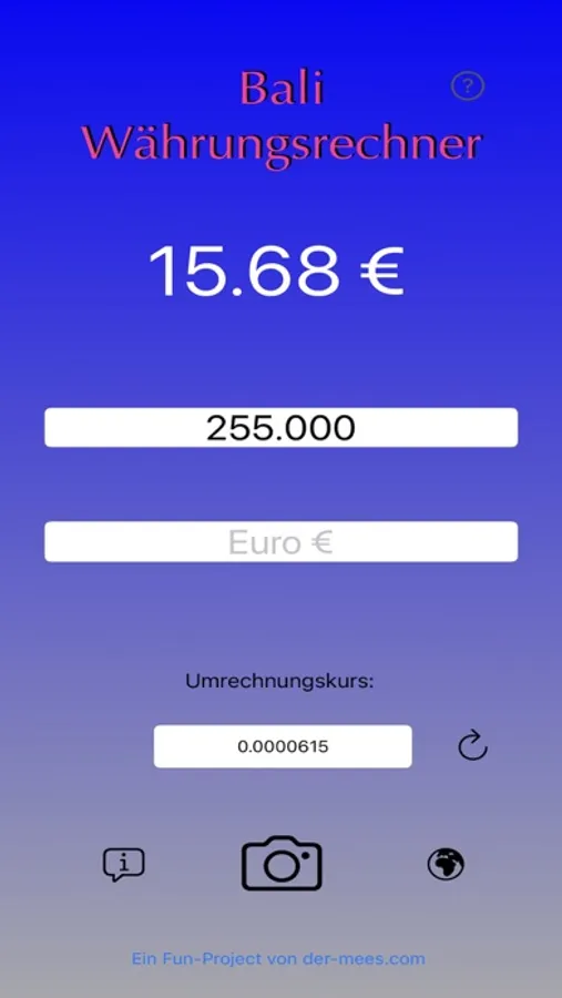 Ein sehr einfacher (also sehr sehr einfach) Währungsrechner um auf Bali nach genügend Cocktails und Bier den Rechnungsbetrag in den lieb gewonnenen Euro umzurechnen.