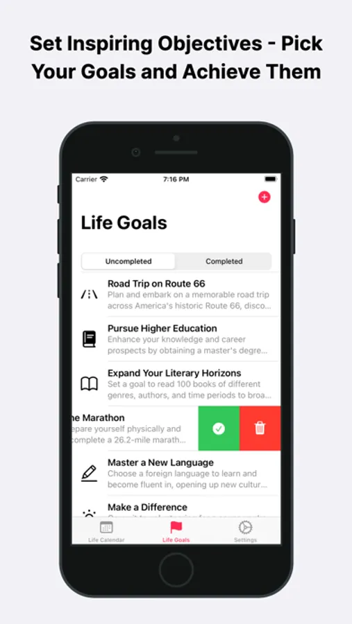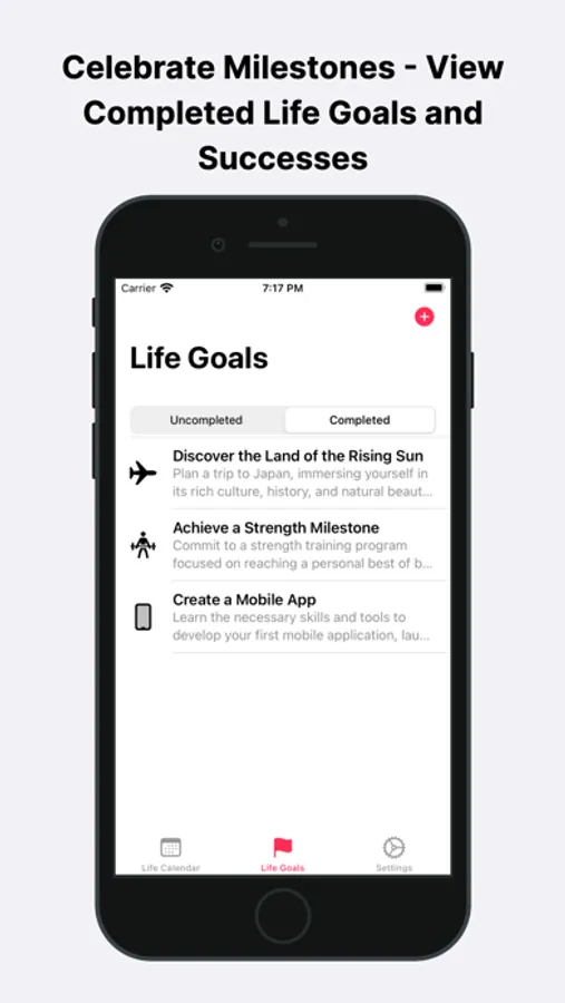 - Life Goals Tracking: Set inspiring objectives, pick your goals, and achieve them with our comprehensive life goals tracking system. Celebrate your milestones by viewing completed life goals and successes.