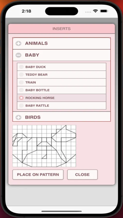 7. Inserts button - add pattern inserts to your pattern (like birds)