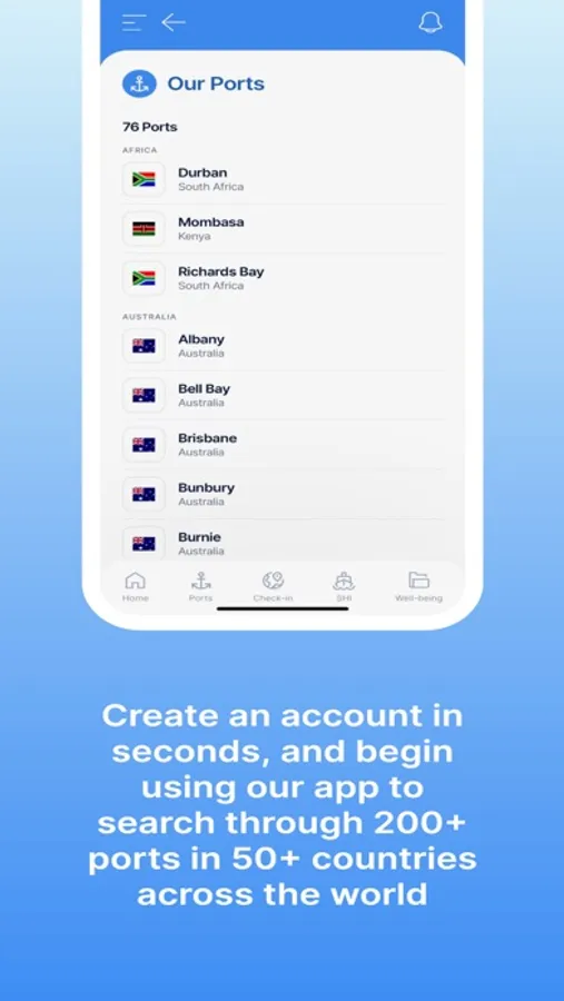 Search through 200+ ports in 50+ countries where you can access our services. Check in to a port and view more in one tap.