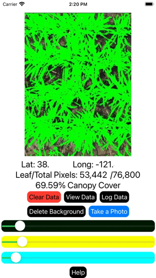 Canopy Cover measures % Canopy Cover non destructively using your device's camera. Canopy cover is calculated from green canopy area. Adjust the sliders to correctly identify canopy area. Longitude and latitude update when you take a picture. Save latitude, longitude, and percent cover data to a text file.
