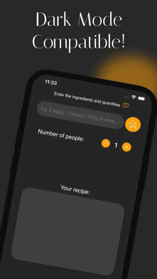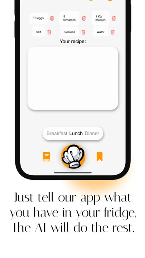 Type what's in your fridge → Get instant personalized recipes for breakfast, lunch, or dinner → Choose serving size → Start cooking!