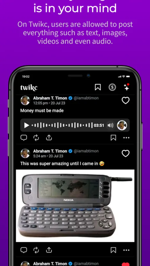Twikc allows users post everything including texts, images, videos, audio and even introduce your friend who have a low number of followers.