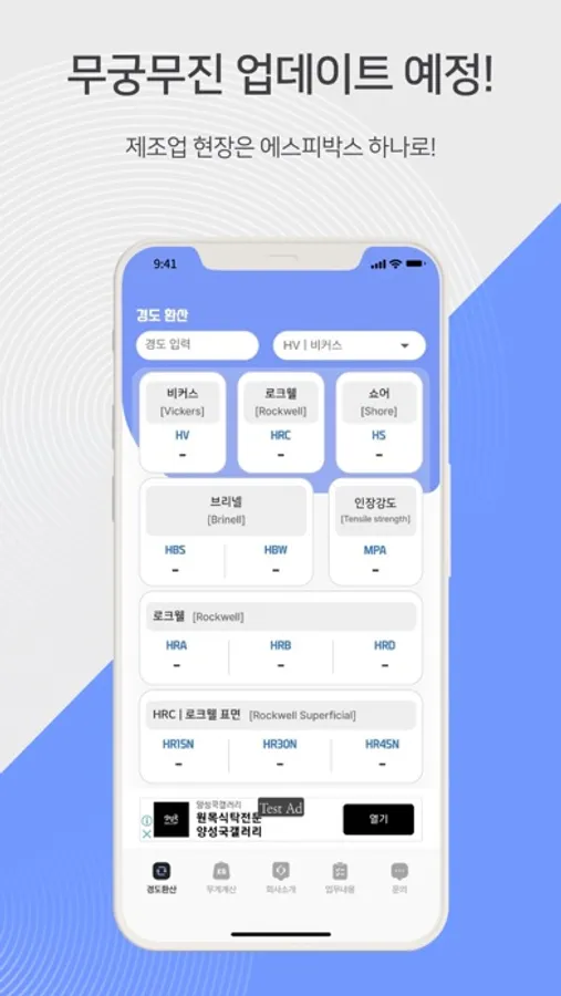 에스피박스는 특정 경도 수치를 로크웰, 쇼어, 비커스, 브리넬, 인장강도 등으로 자동 환산해주는 앱입니다.