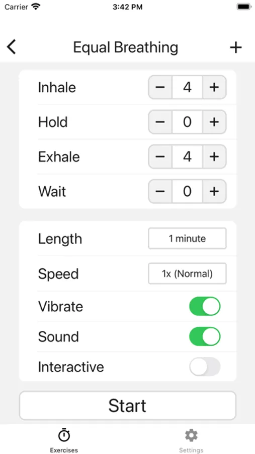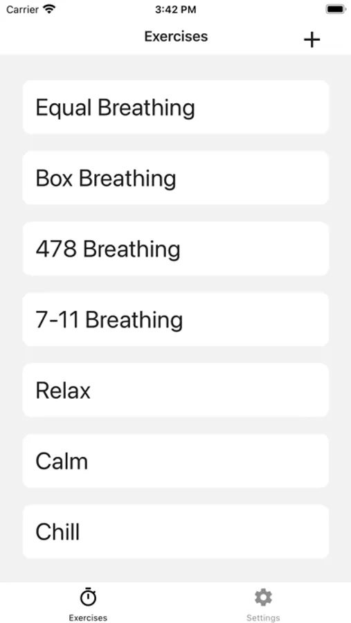 Each exercise can be fully customized with respect to the duration of each step (inhale, hold, exhale, wait). The speed can also be set to fit your breathing style and lung capacity.