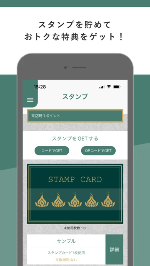 スタンプ:ご来店ごとにたまるスタンプカード。お得な特典をご用意しています。