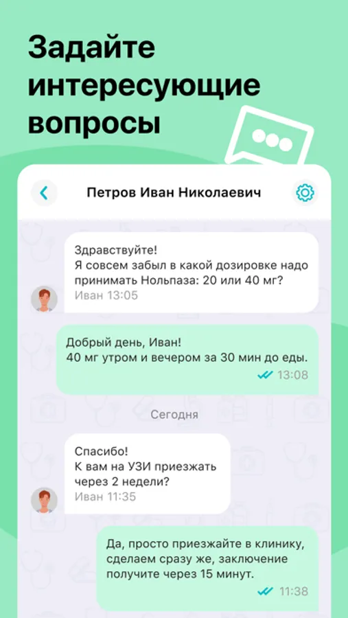 Удобно общайтесь с врачами в формате чата или видео, задавайте интересующие вас вопросы;