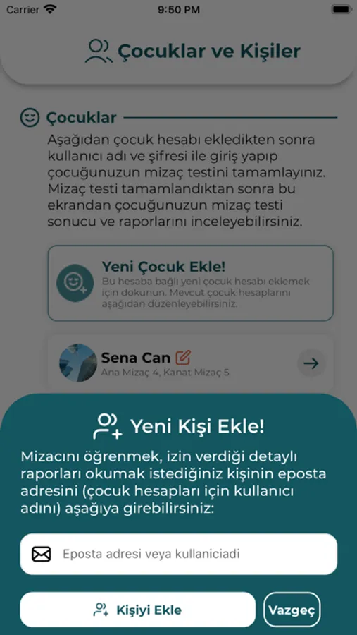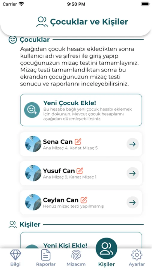 - Çocuk Mizaç Testi: Çocuklarınızın da mizaçlarını anlamak istiyorsanız, onlar için de mizaç testi yapabilirsiniz. Uygulama, kolay bir şekilde kendi hesabınıza çocuk hesabı eklemeye izin verir, onların da mizaç özelliklerini takip etmenizi sağlar.