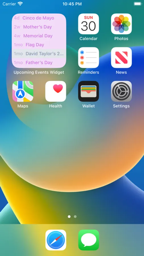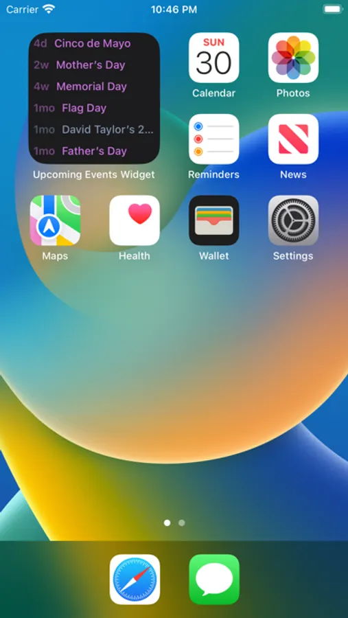 A calendar widget that looks up to a year in the future for your events. The other calendar widgets I found only looked ahead a day, maybe three. I wanted to know the next 5 or 10 things coming up, no matter if they were next week or next month. So I built this calendar widget. It's got some options for configuration the time display format, either time until, or time of. And choosing which calendars it displays entries from. All of the colors in the widget come from your system dark/light preference, as well as the colors you chose for your calendars. It updates every 5 to 10 minutes depending on how iOS is feeling.