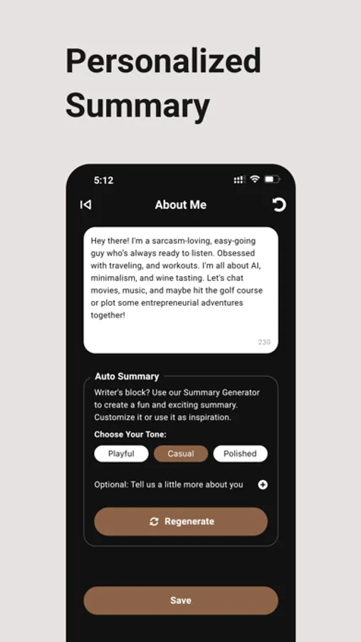 Can’t find the words? Our AI helps write your bio in a way that captures your true self—beyond just “I like pizza” (though, who doesn’t?). Think of it as your personal hype assistant, making sure your profile reflects the real you.