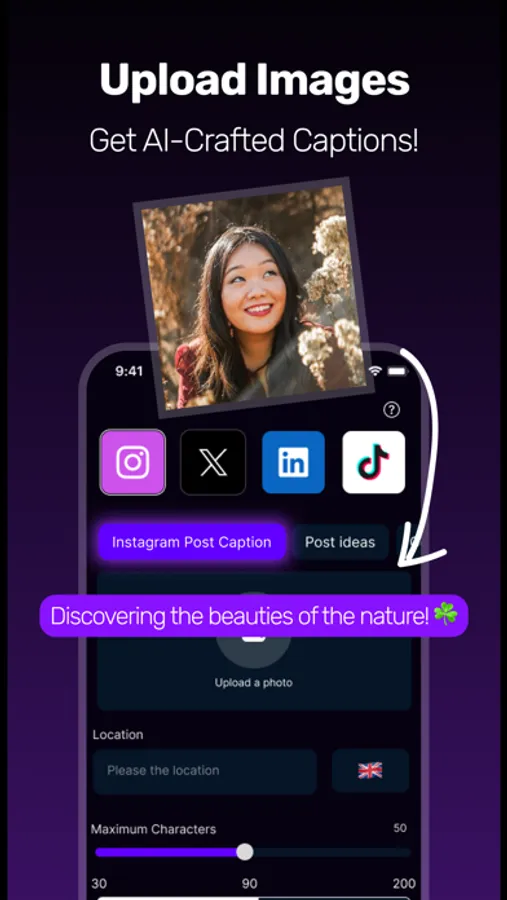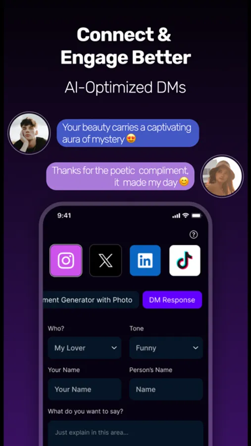 Instagram Tools: Amplify your Instagram presence with generating engaging social media posts to crafting responses with our Comment Generator, Caption Generator with Photo, Comment Generator with Photo, Post Ideas Generator and DM Response features.