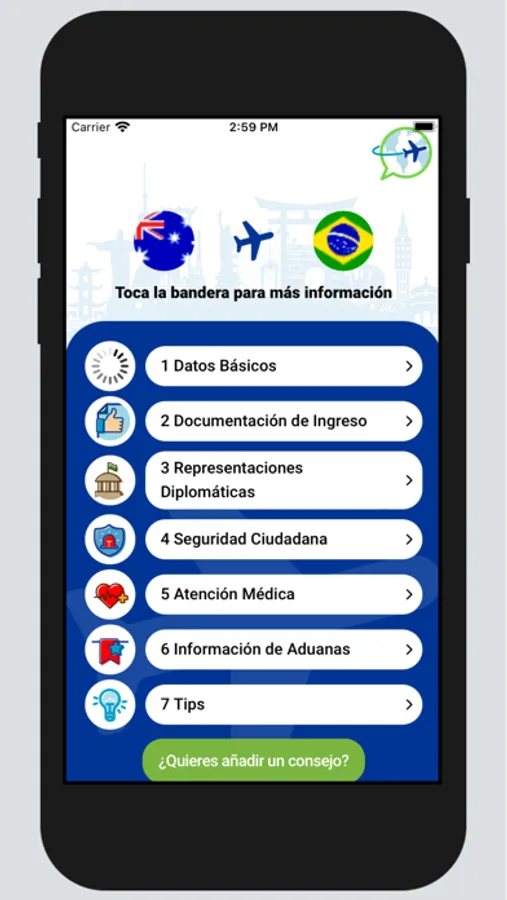 7.- Tips; encuentra numerosas recomendaciones y tips del país que visitas, tales como moneda, números de emergencia, calidad del agua, transporte público, voltaje y enchufes, y mucho más.