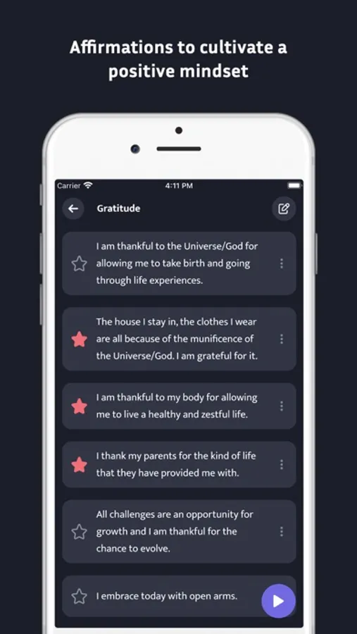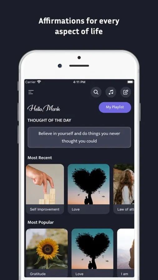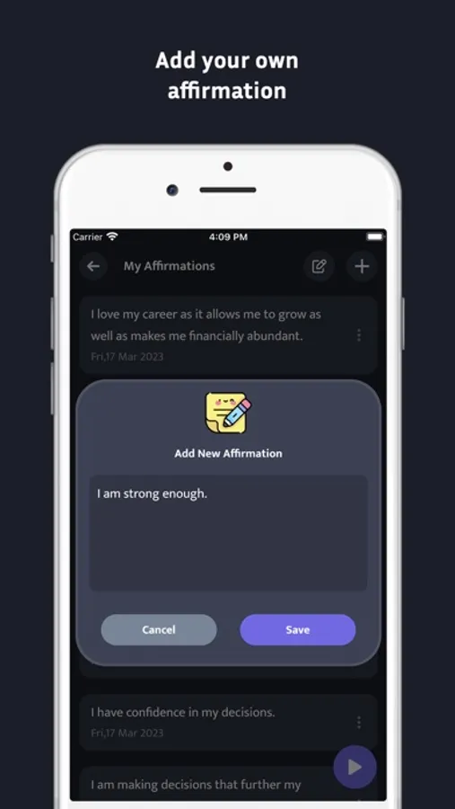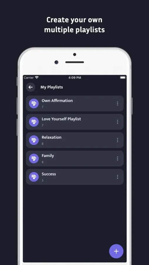 - You can create your own custom playlist of your affirmation collection. You can add app’s affirmations to your custom playlist.