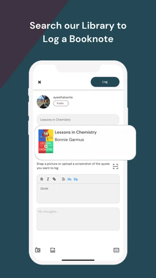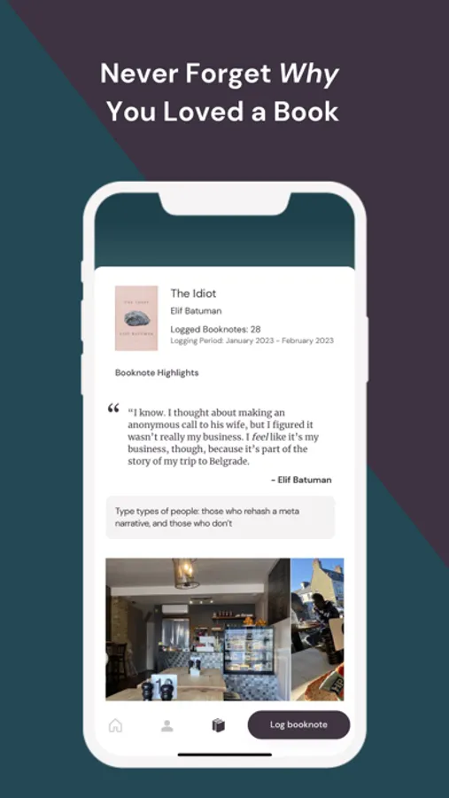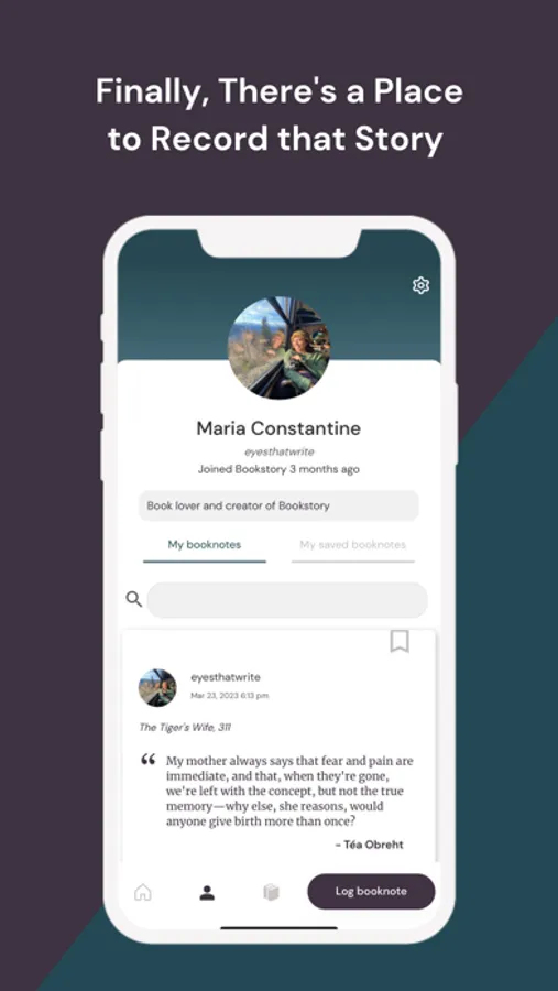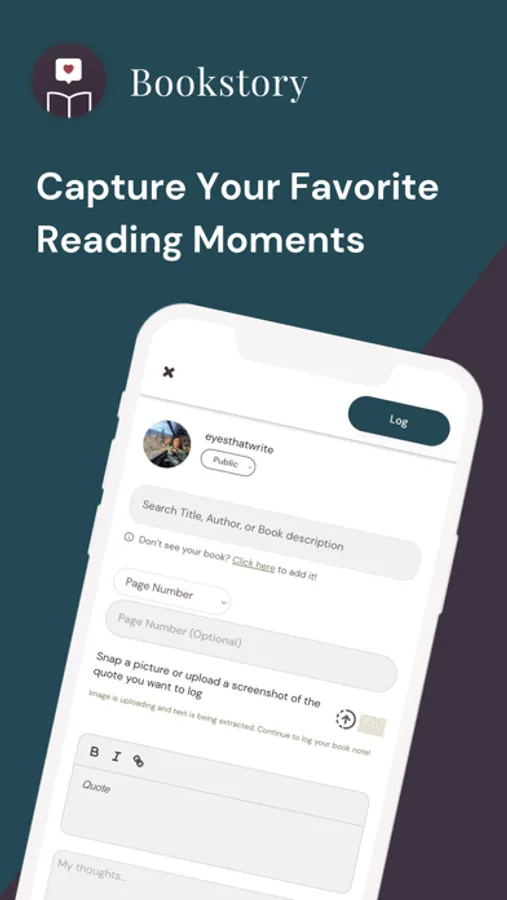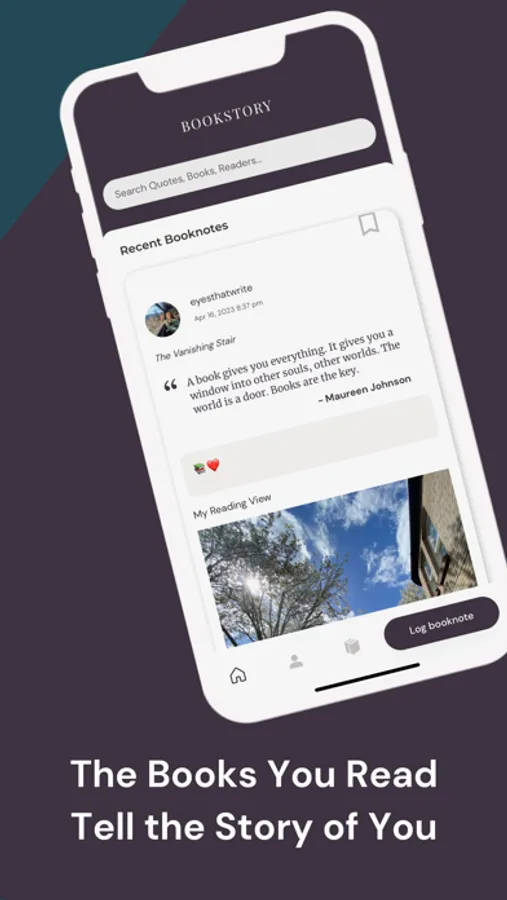 Bookstory allows you to capture the Reading Moments that inspire, surprise and delight you! Log a Booknote to capture a quote and jot down your thoughts—why did you love it? What made this moment special? You can also tag each logged Booknote with your Reading View: an unfiltered picture of where you were during that Reading Moment.