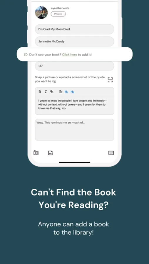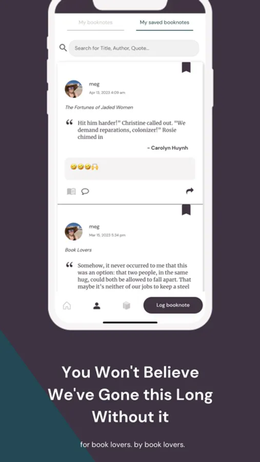 Are you guilty of screenshotting quotes? Have you ever written down a memorable phrase from a story only to lose the scrap paper or Note on your phone where you tracked it? Have you ever been in conversation about a meaningful book, wanting to reference a SWOON moment or an inspiring quote, only to paraphrase it and completely lose the power of the quote in translation? Bookstory is the answer! Log those special Reading Moments for easy reference later, deeper engagement with books, and nostalgic reminiscing.