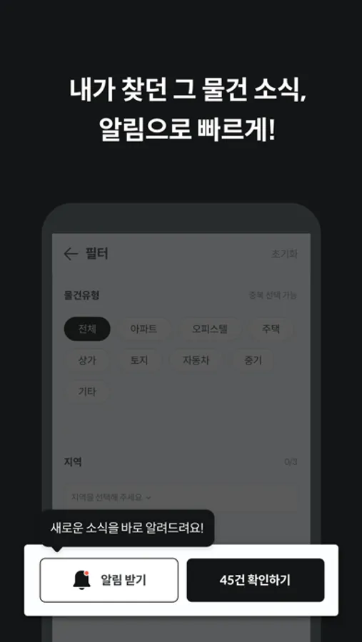 관심 있는 물건 소식은 물론, 원하는 조건의 물건 소식도 알려드려요.