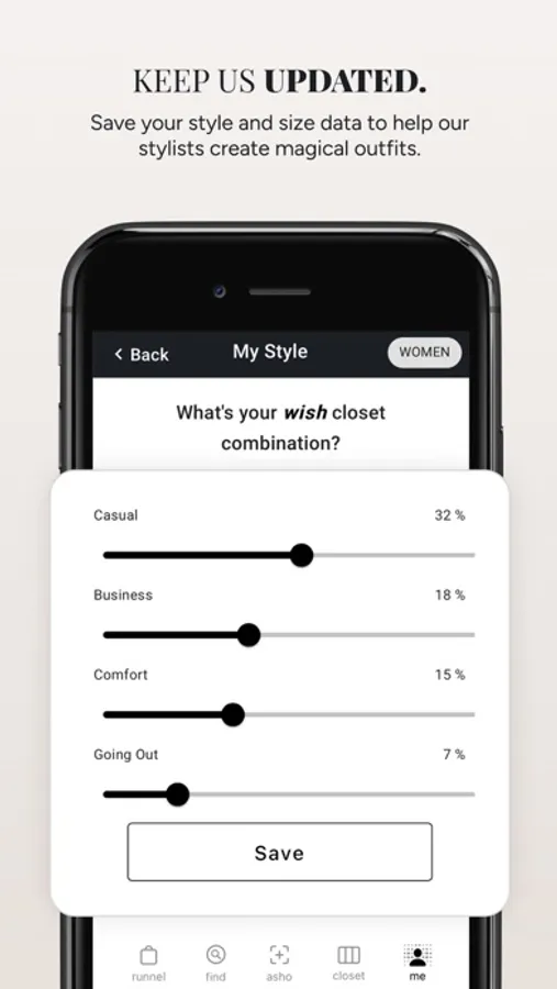 • Keep us updated. By saving your style and size data, our talented stylists can create magical outfits tailored specifically for you. Experience the joy of discovering new styles and effortlessly staying ahead of the fashion curve.