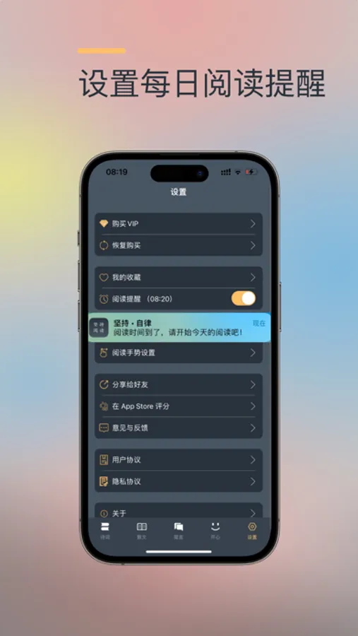 1.会员权益:解锁全部诗词分类、专属标识、清除广告等。