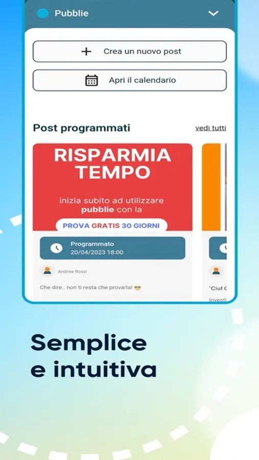 Differenzia e caratterizza i tuoi post in base al canale social. Scegli se pubblicarli subito o programmarli impostando giorno e orario predefiniti.
