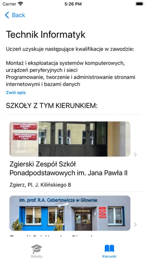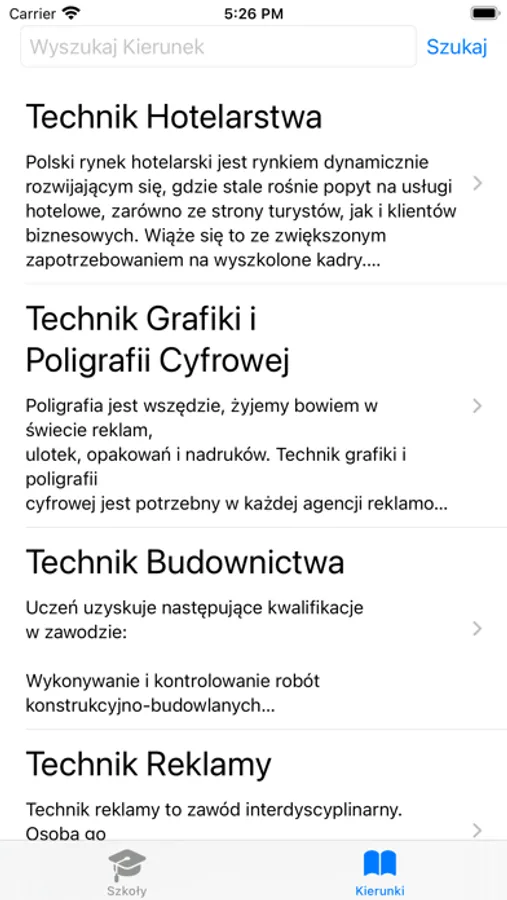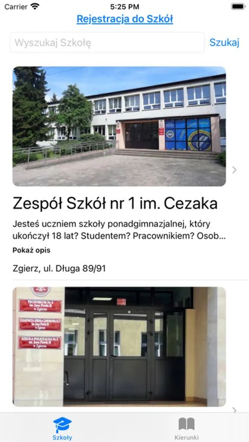 Użytkownicy mogą wyszukiwać i wyświetlać szczegółowe informacje na temat szkół i kierunków kształcenia w szkołach.