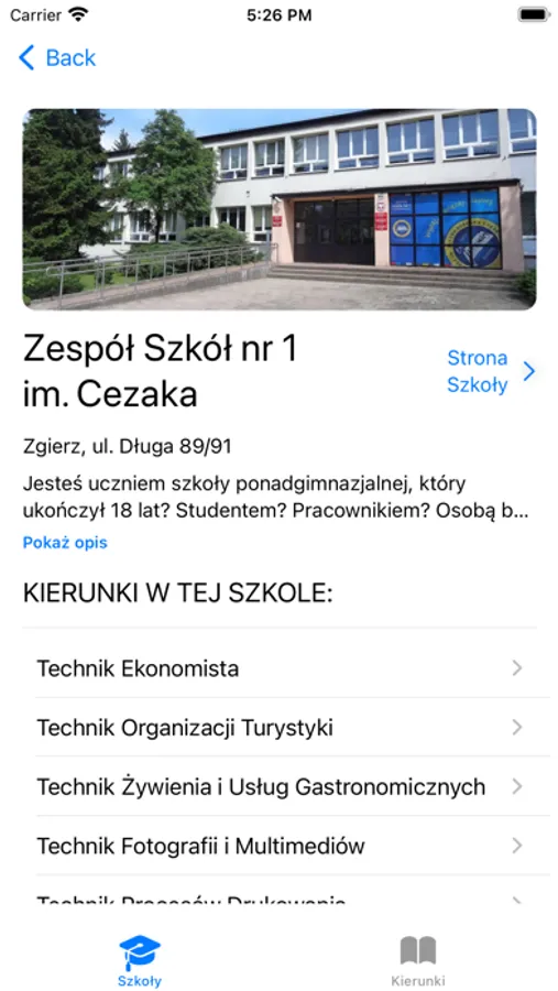 Aplikacja służy do zapoznania się z ofertą szkół ponadpodstawowych w powiecie zgierskim.