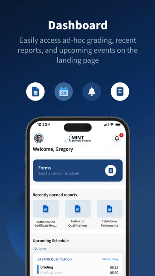 MINT TMS app is the on-the-go connection to the MINT Training Management System, MINT TMS. The app allows you to quickly and easily access up-to-date schedule info, complete forms (online or offline), visualize reports on MINT data, and display automatic notifications.