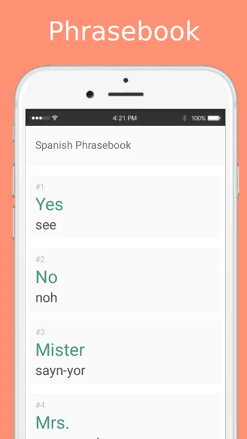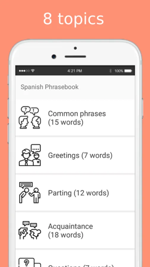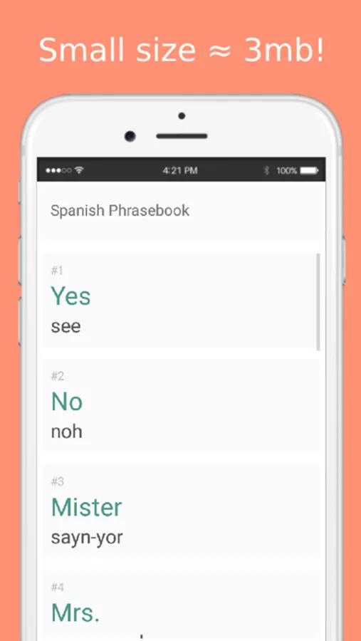 The Spanish Phrasebook can be used respectively as a phrasebook and a tool for learning Spanish. All Spanish words are written in English letters and divided into 8 logical topics, that is, the phrasebook is designed for an English-speaking user (tourist).