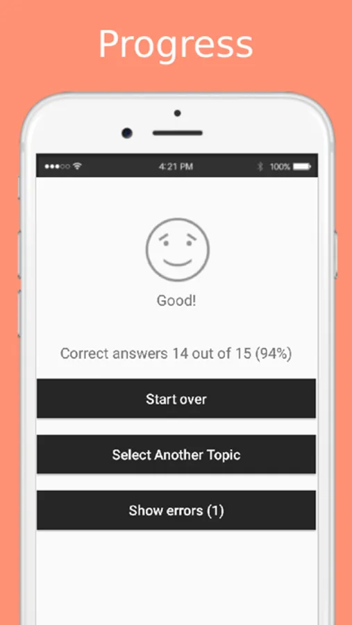 After passing the test on the selected topic, you can view the errors. Also, the result of passing the test for each of the topics is saved, your goal is to learn all the words in the selected topic by 100%.