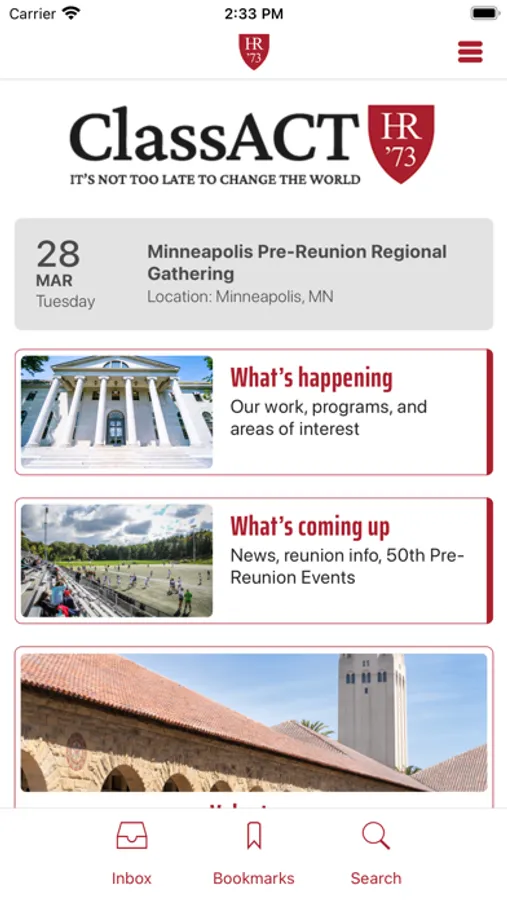 Introducing ClassACT HR73, a mobile app initiative created by the members of the Harvard-Radcliffe Class of 1973, aimed at promoting positive social change. The app's purpose is to unite the Class of 1973 in addressing crucial issues at the local, national, and international levels by supporting and creating positive change. Additionally, the app intends to foster deeper relationships among classmates, resulting in a more enriching experience for all users. Join ClassAct HR73 today and become part of the movement towards positive social change.