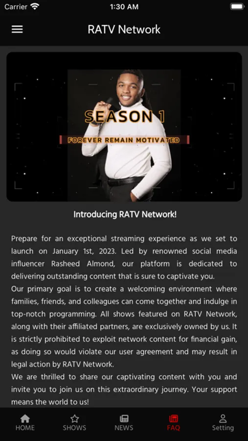 At RATV Network, we strive to create a platform where families, friends, and colleagues can come together and enjoy top-quality programming. All shows available on our network are exclusively owned by RATV Network and its affiliated partners. Any unauthorized use of our content for monetary gain or personal benefit will be considered a violation of our user agreement, subject to legal action by RATV Network.