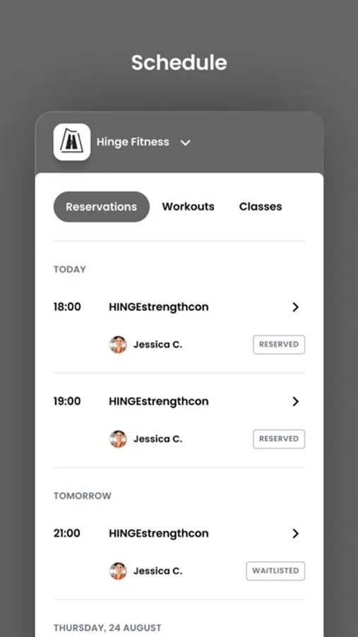 For members of Hinge Fitness to reserve their place in a class, sign up for gym events, and general account management like updating headshots and credit card on file.