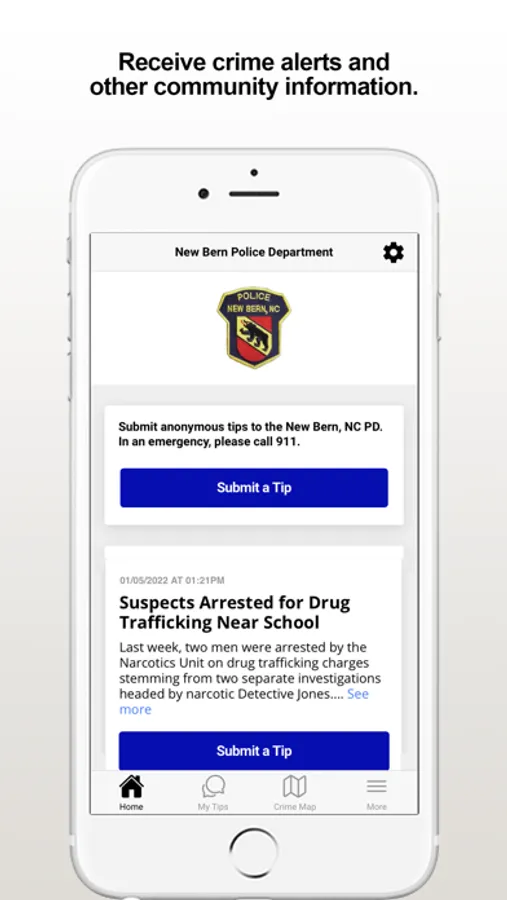 The New Bern PD app provides citizens the ability to submit anonymous tips to the New Bern, NC Police Department. The app also displays agency crime alerts and other organization web and social media content.